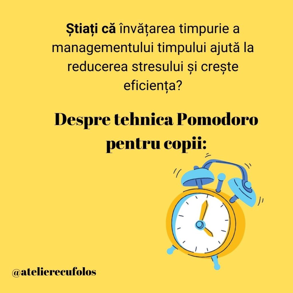 Participarea la acest atelier oferă copiilor oportunitatea de a dezvolta abilități de organizare a timpului, vor învăța două tehnici practice și vor diferenția activitățile sănătoase de cele consumatoare de timp.